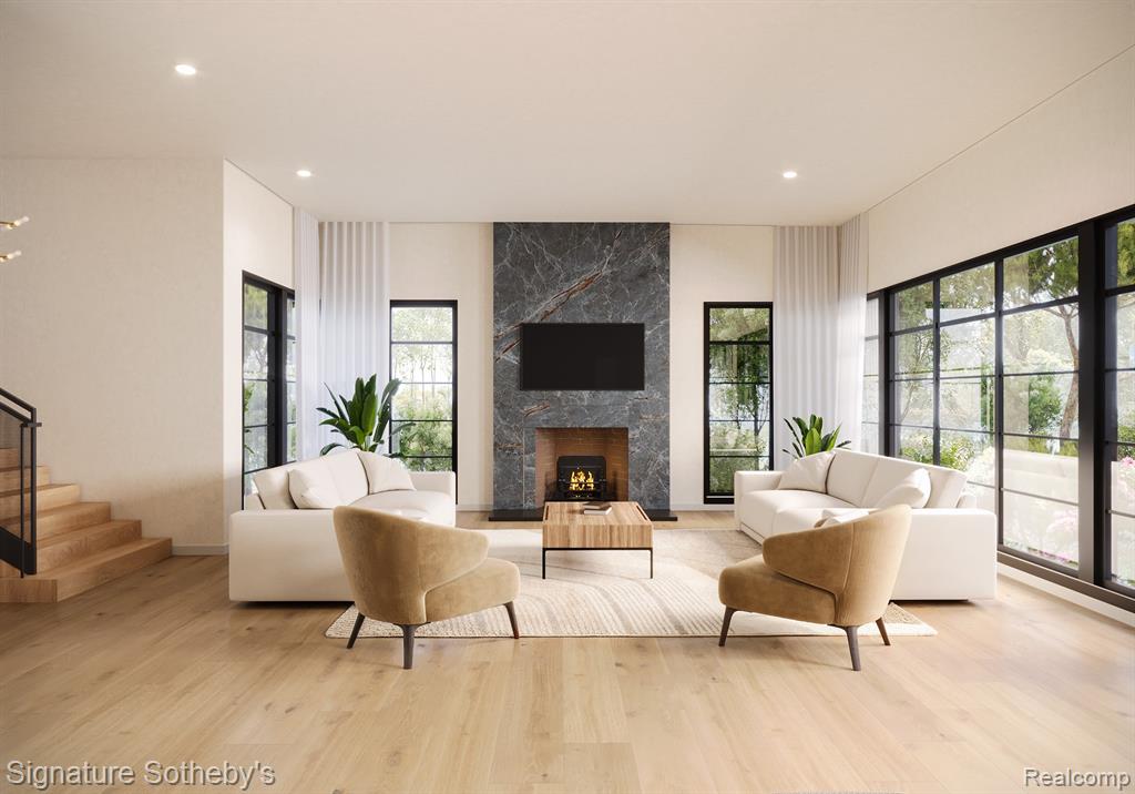 Introducing a striking residence by Hunter Roberts Homes—this 3-bedroom, 3.1-bathroom home spans 3,800 sq ft and is positioned in the heart of Downtown Birmingham. Defined by a bold modern aesthetic, the sleek facade and expansive glass windows create a dramatic yet refined presence. Inside, an open-concept layout connects the kitchen, dining area, and living room, where a central fireplace serves as a sophisticated focal point. Floor-to-ceiling windows flood the space with natural light, enhancing the home’s clean lines and modern elegance. A front library offers a quiet retreat, while the private elevator ensures seamless access across all levels.